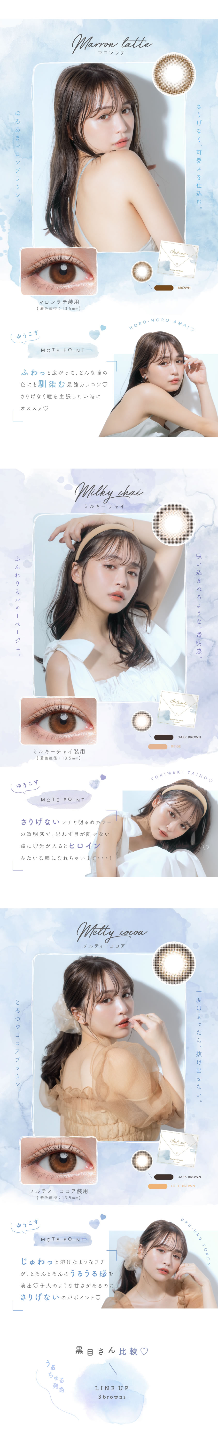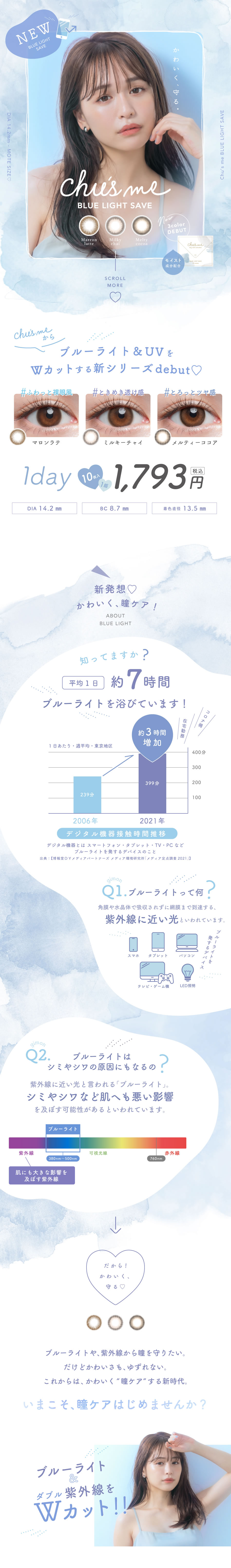 ご使用前に添付文書をよく読み、取扱方法を守り、正しくお使いください。1日の装用時間を厳守し、一度外したレンズは再使用しないでください。ご使用後、眼に異常を感じた場合は、直ちに使用を中止し、眼科医の検査を受けてください。