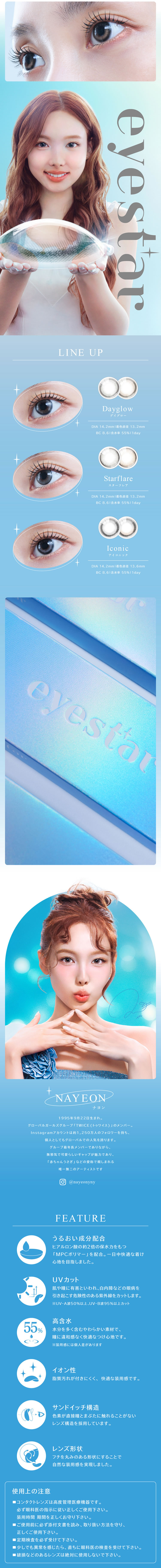 ご使用前に添付文書をよく読み、取扱方法を守り、正しくお使いください。1日の装用時間を厳守し、一度外したレンズは再使用しないでください。ご使用後、眼に異常を感じた場合は、直ちに使用を中止し、眼科医の検査を受けてください。