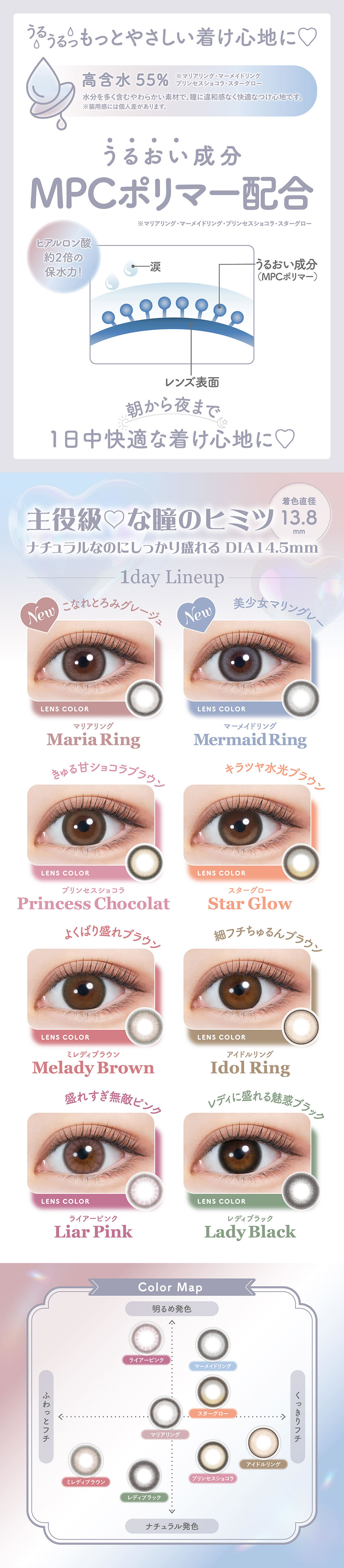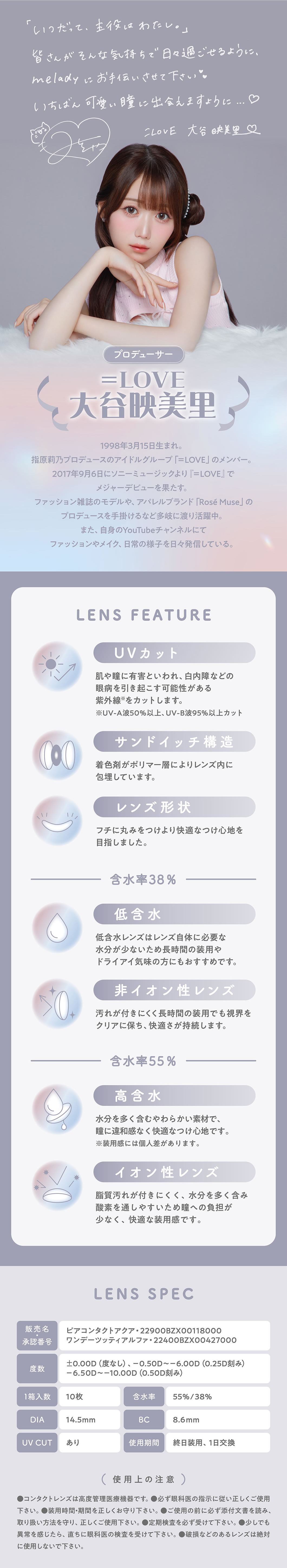 ご使用前に添付文書をよく読み、取扱方法を守り、正しくお使いください。1日の装用時間を厳守し、一度外したレンズは再使用しないでください。ご使用後、眼に異常を感じた場合は、直ちに使用を中止し、眼科医の検査を受けてください。